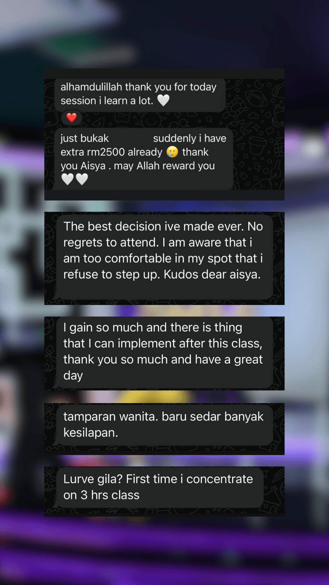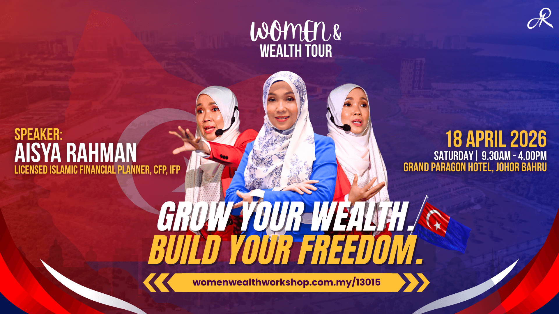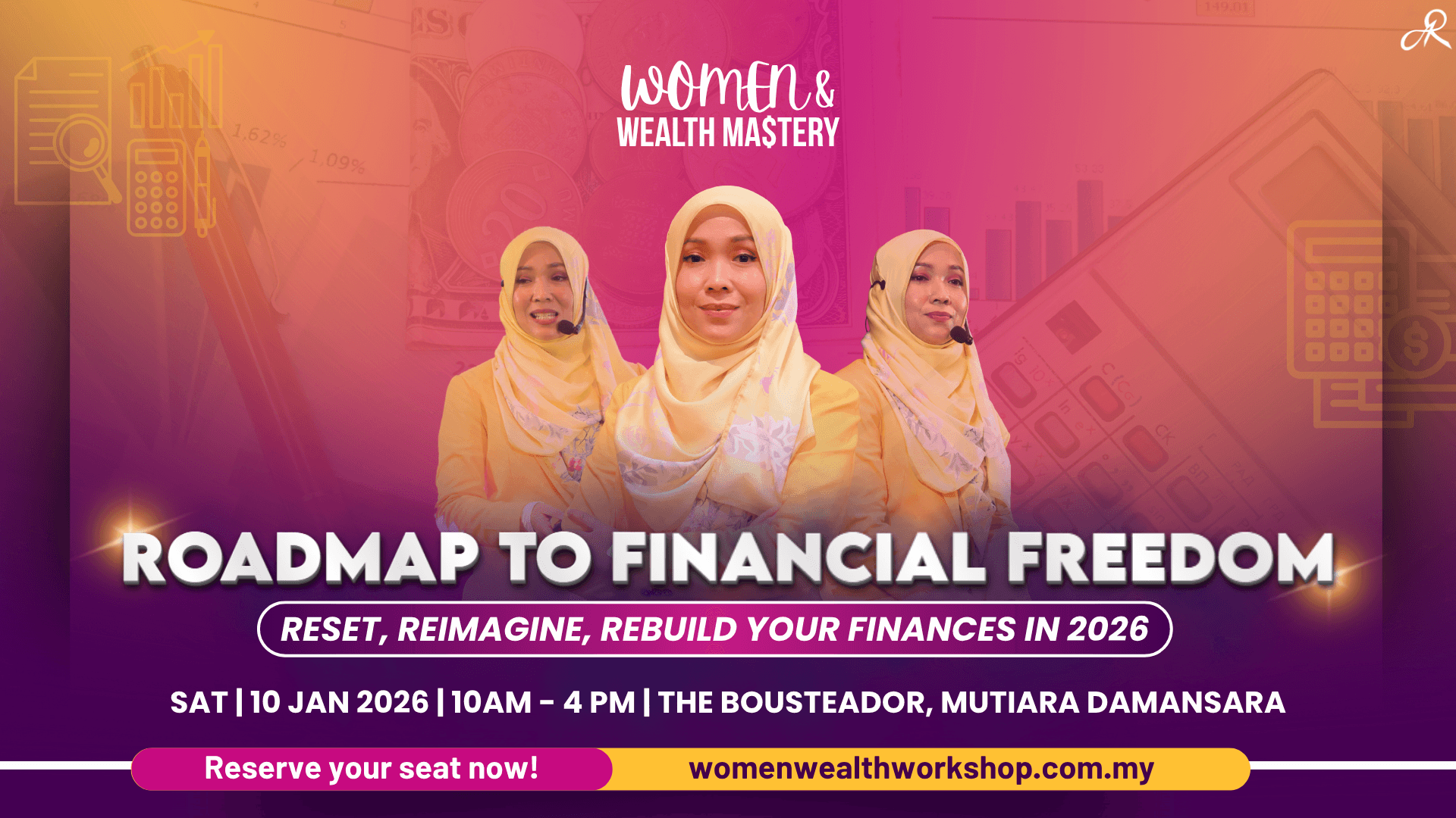 In the event of unforeseen circumstances, the organiser (Women & Wealth by Aisya Rahman Advisory Sdn. Bhd.) reserves the right to reschedule, cancel, or conduct the programme online.